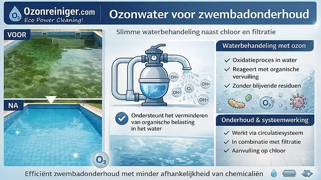 Volledig overzicht: ozonwater kennisbankgids. Hoe ozon werkt in zwembadwater: ozonwater zwembad. Aanpak bij algengroei: algen zwembad ozonwater. Twee-doekenmethode voor oppervlaktereiniging rondom het zwembad: twee-doekenmethode.